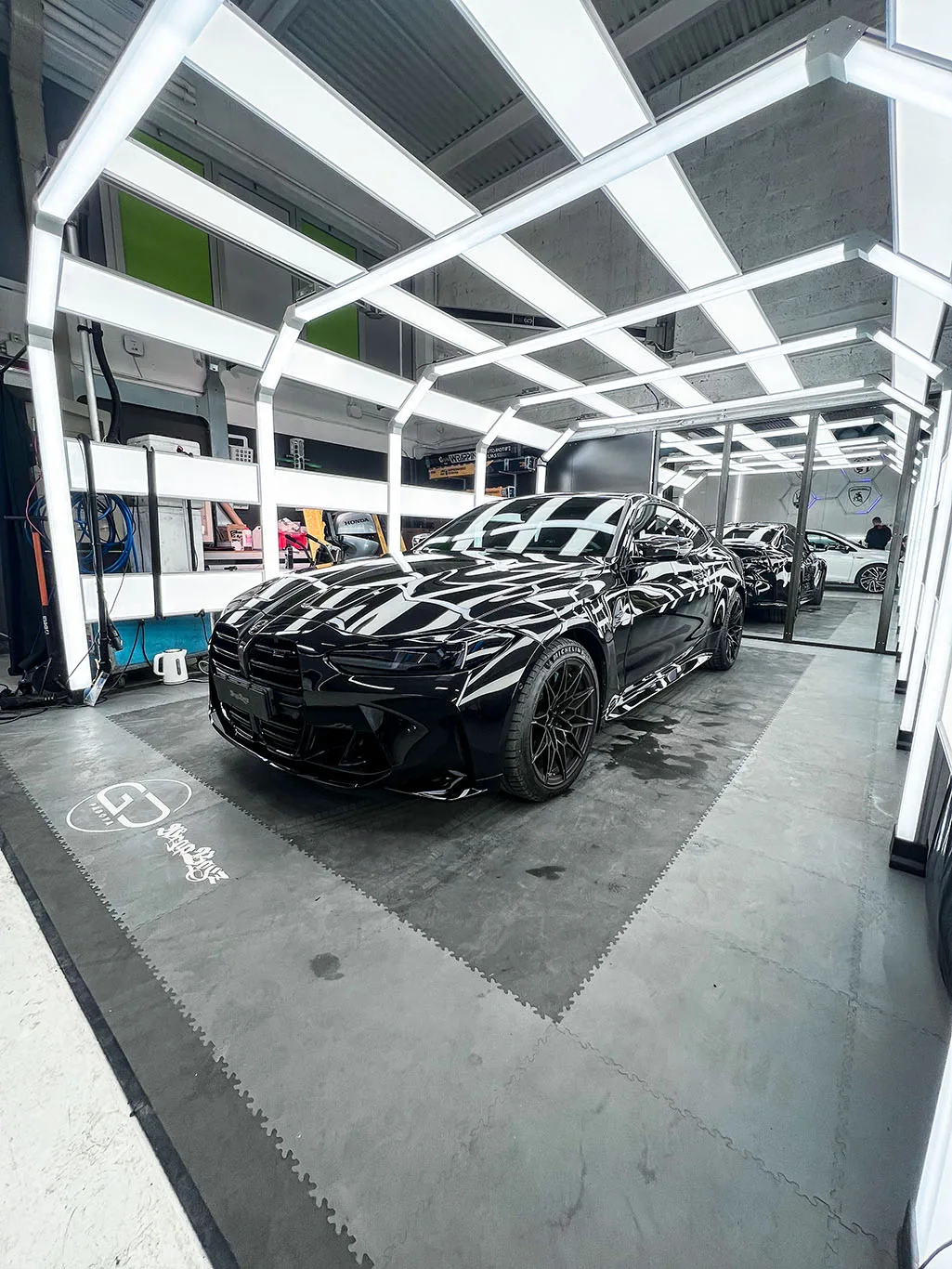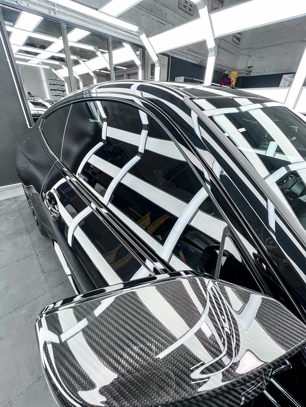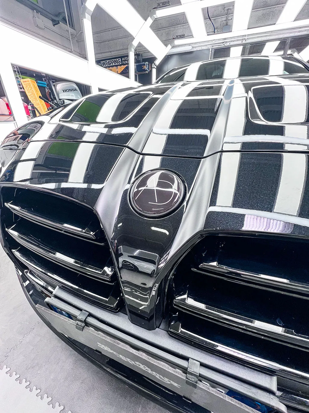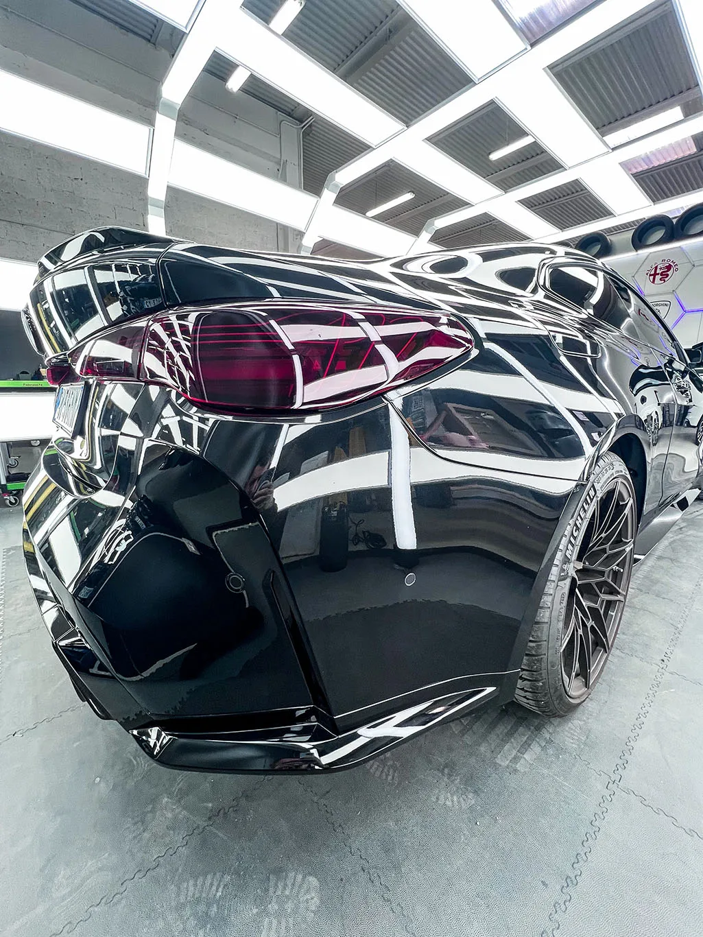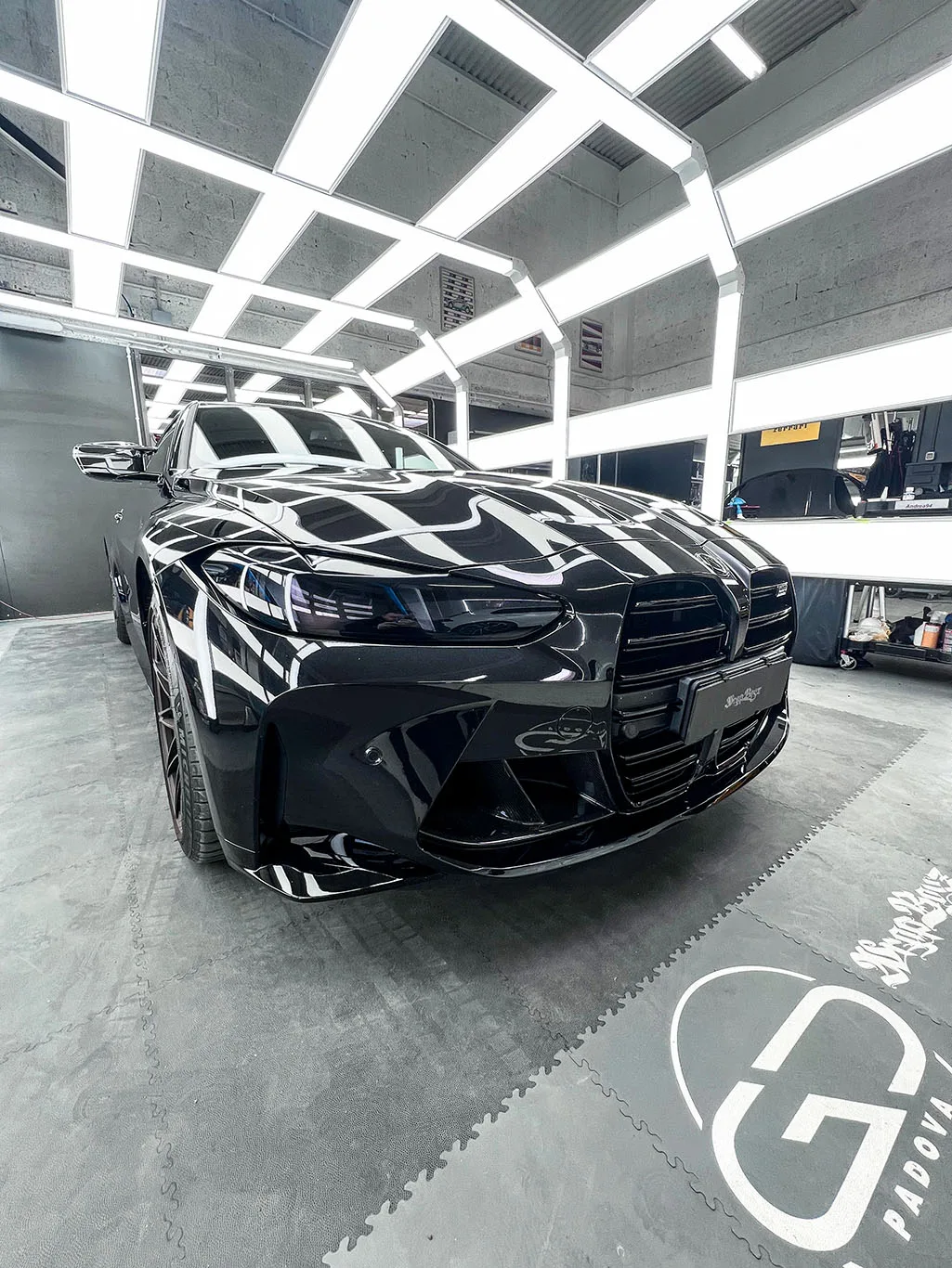 Oscuramento fari anteriori e posteriori con ppf antisasso 35%. Livrea su cofano con pellicola 3M Black Satin + oscuramento vetri anteriori con pellicola nanoceramica 35%. Loghi in nero opaco con adesivo resinato personalizzato.