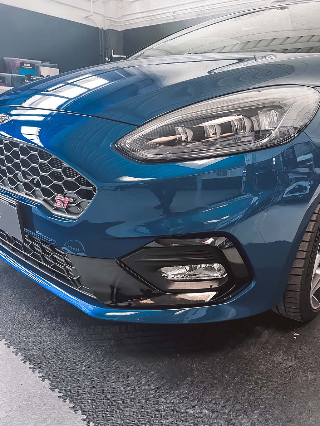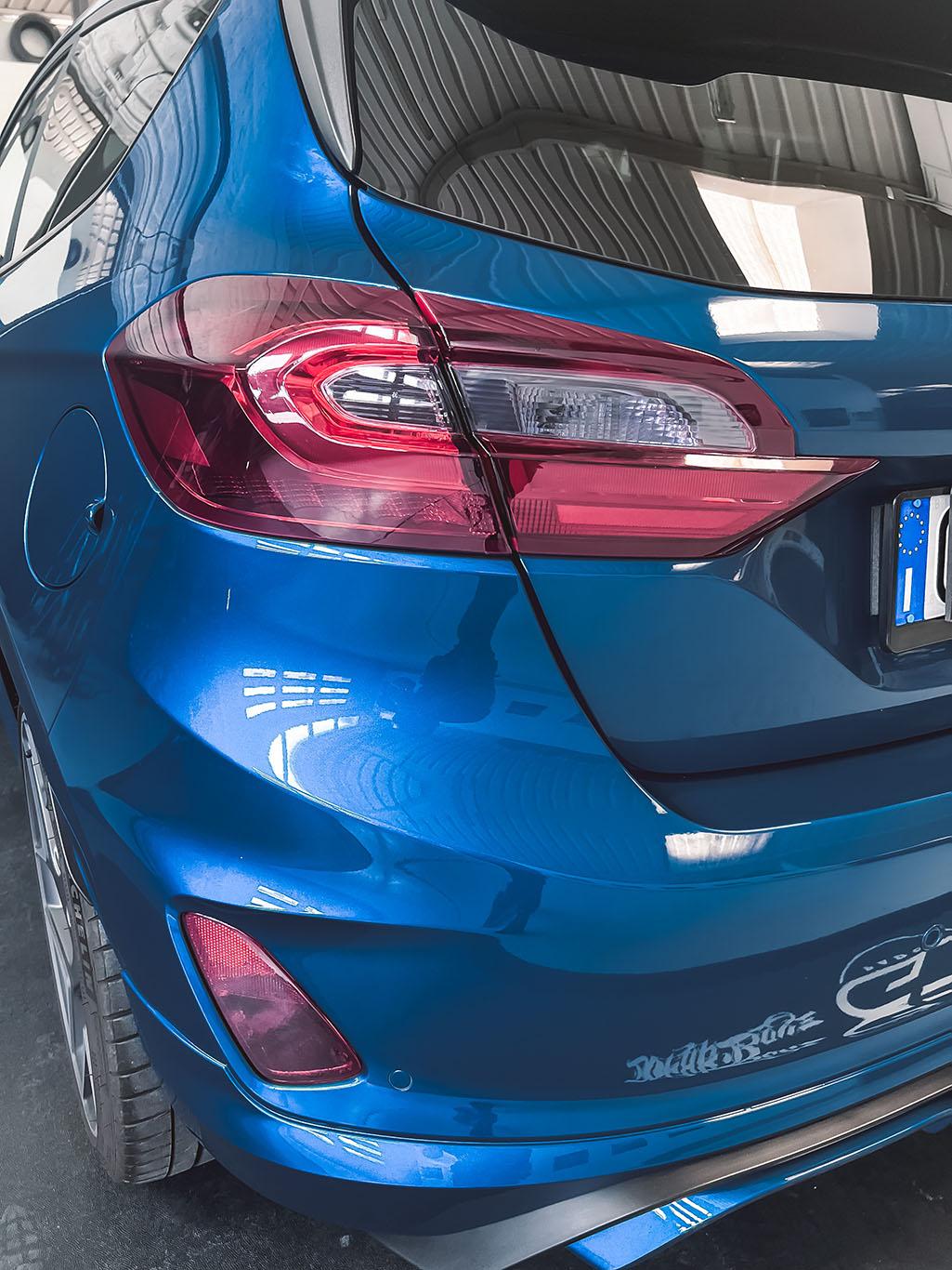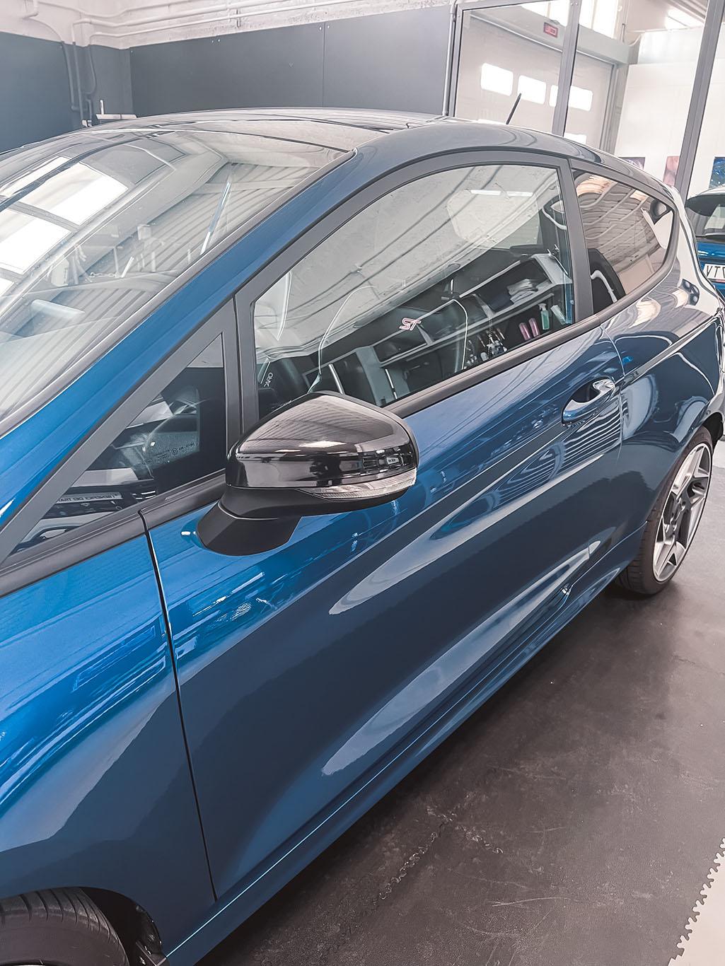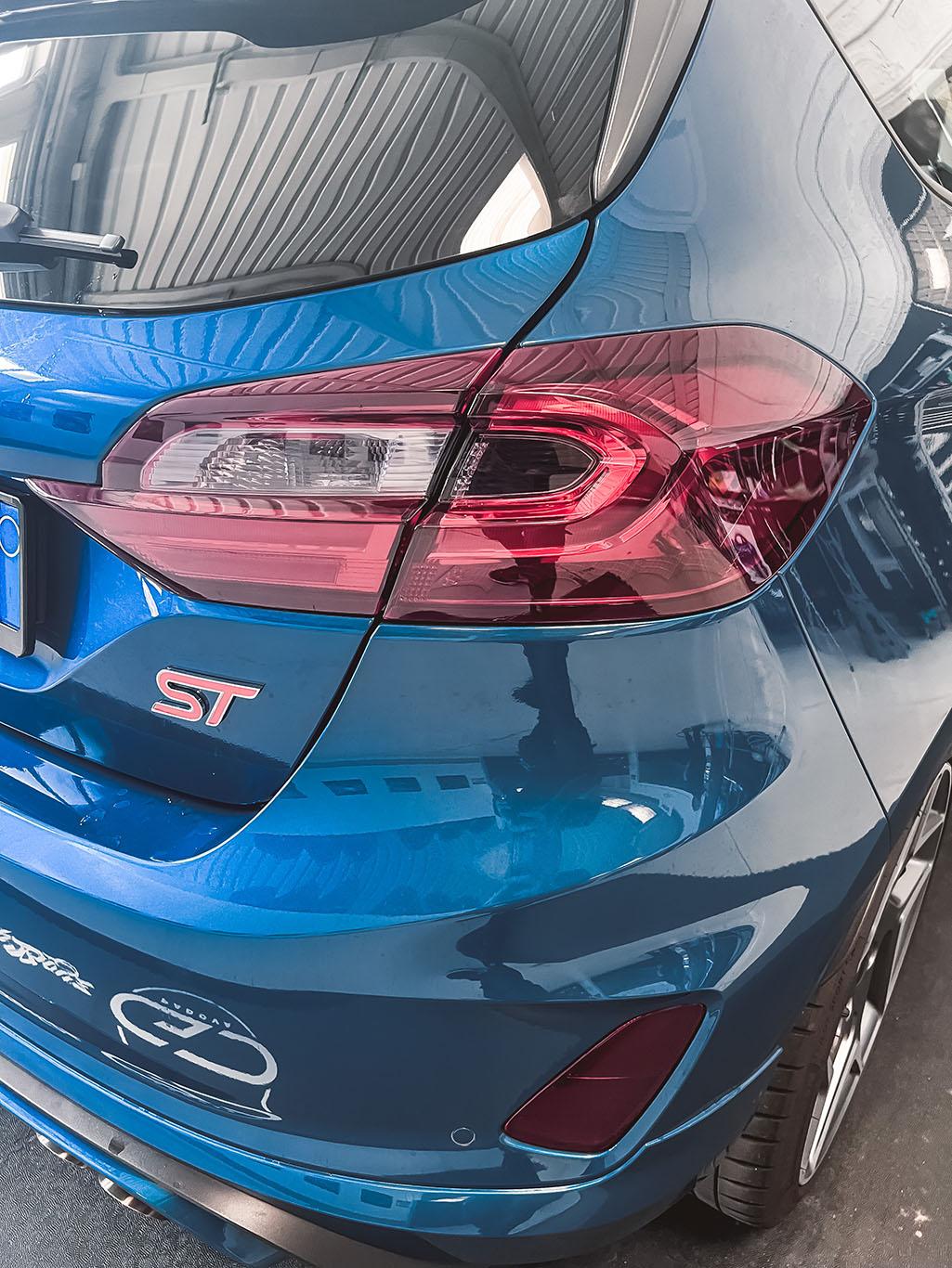 Per questa Ford Fiesta ST abbiamo dato un tocco di originalità. Specchietti retrovisori e baffi anteriori in nero lucido con pellicola 3M 2080 a lunga durata. Per concludere abbiamo protetto e oscurato la fanaleria posteriore con pellicola antisasso Xpel State 35.