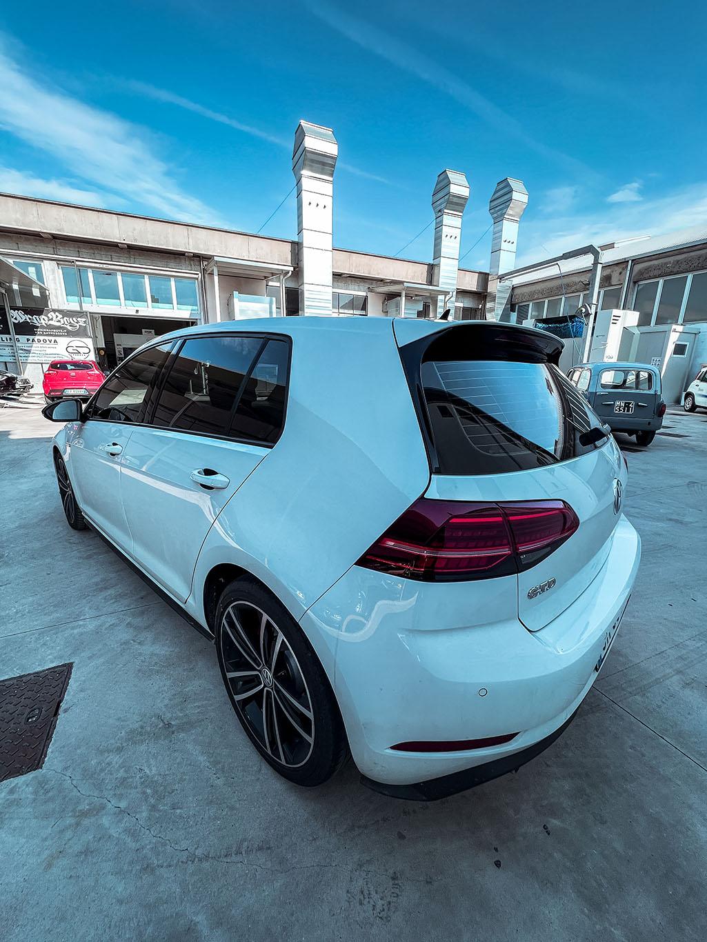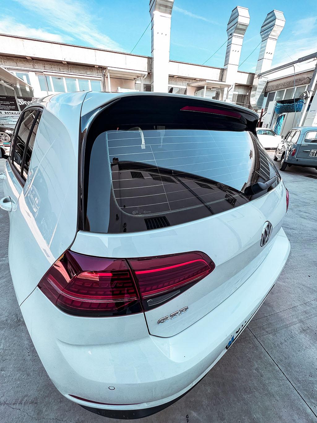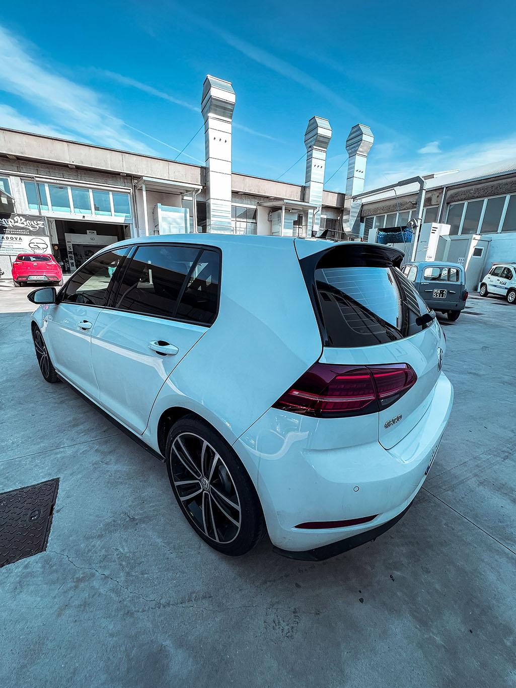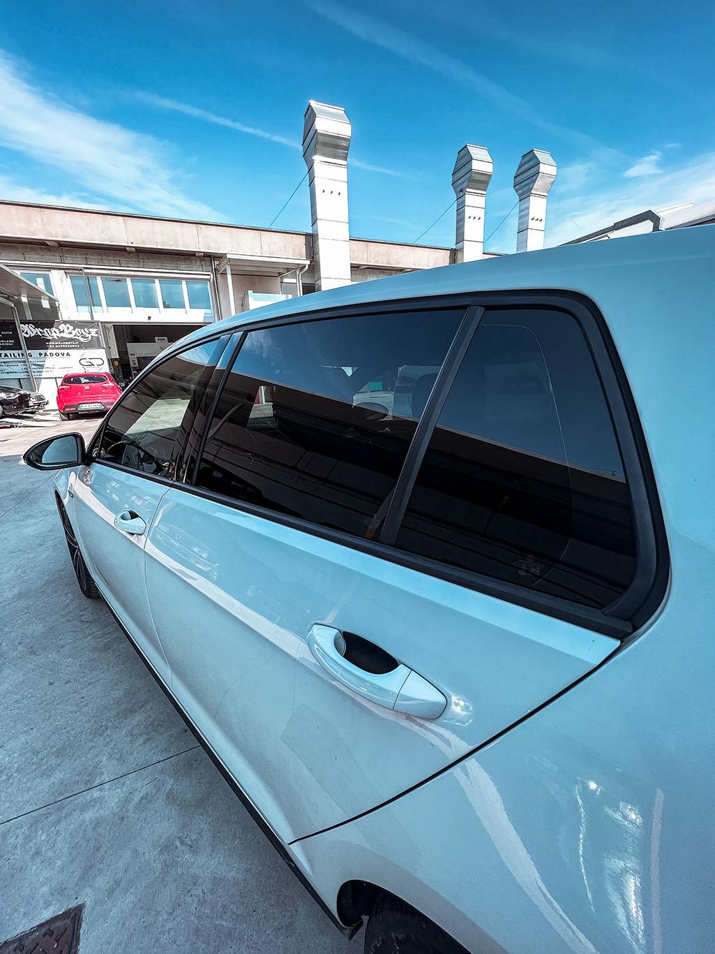 oscuramento vetri totale con tonalità 15% al posteriore e 5% all’anteriore. L’utilizzo di pellicole oscuranti nanoceramiche permette l’abbattimento termico all’interno dell’abitacolo. Inoltre, non poteva mancare, un rivestimento del tetto con pellicola in nero lucido 3M 2080 per dare un tocco di classe a questa splendida vettura!