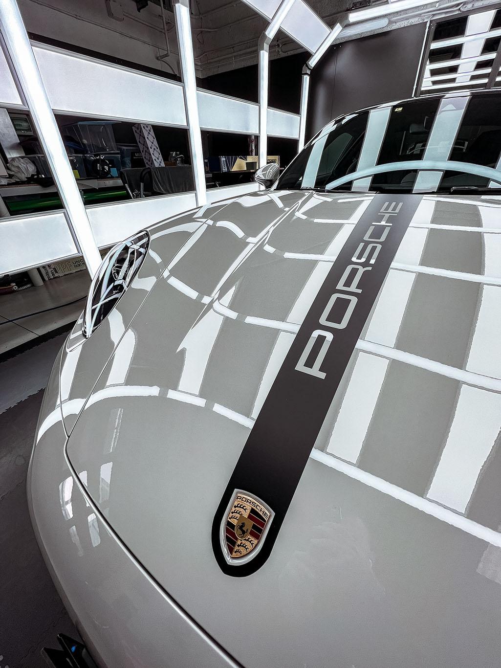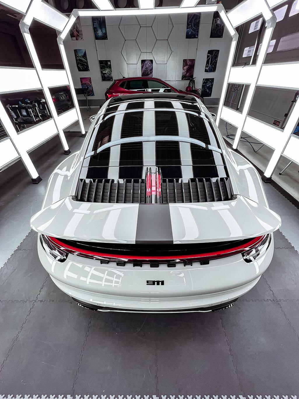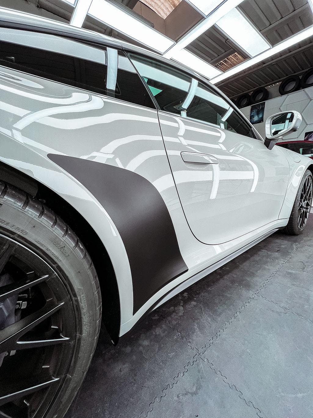 Livrea Porsche per questa fantastica 992 su cofano e alettone posteriore in colorazione nero satinato cosi come fender parasassi posteriori e minigonne!