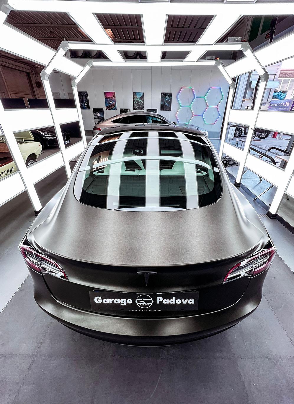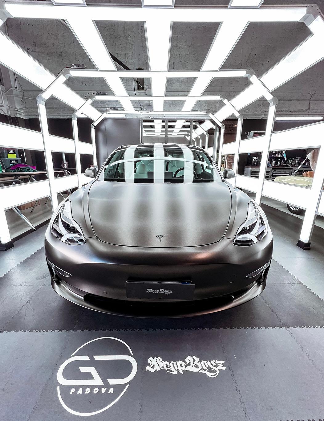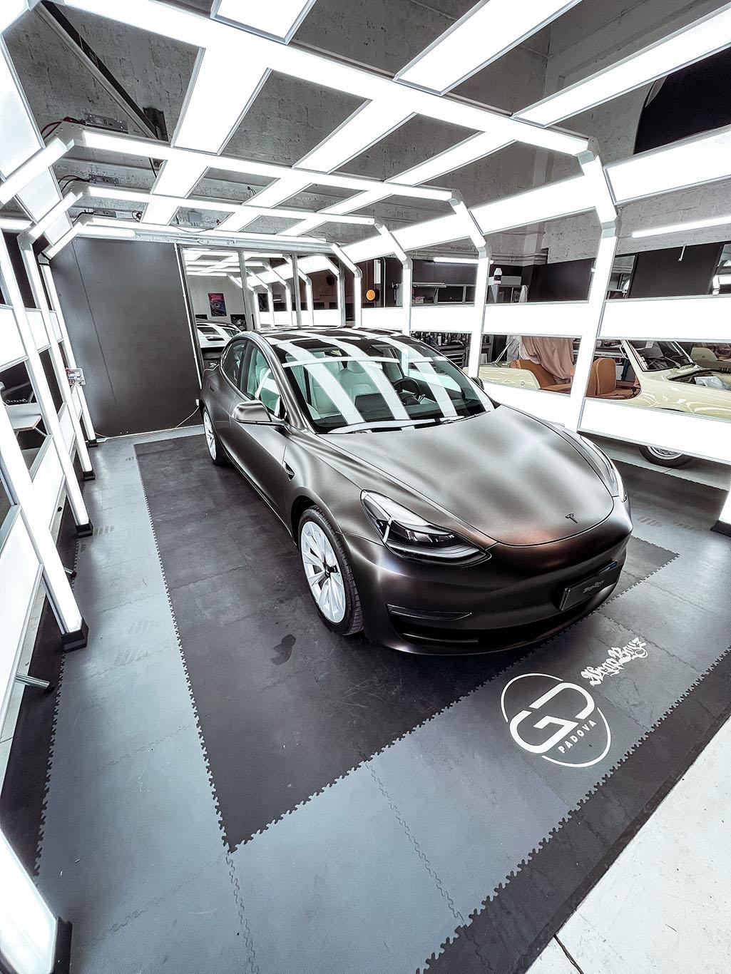 Rivestimento completo con pellicola 3M 2080 Black Dust Gold. Questa colorazione è molto particolare, il colore base è nero satino che in aggiunta all’oro metallizzato creano dei riflessi che accentuano le ‘nervature’ della vettura. Inoltre abbiamo sostituito i loghi della vettura con emblemi in nero opaco.