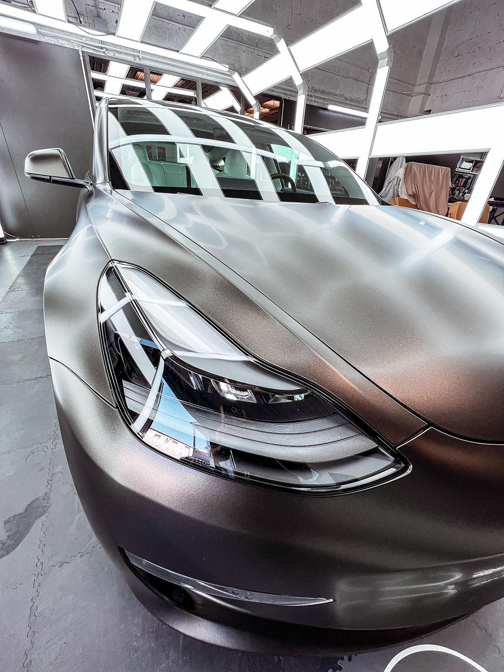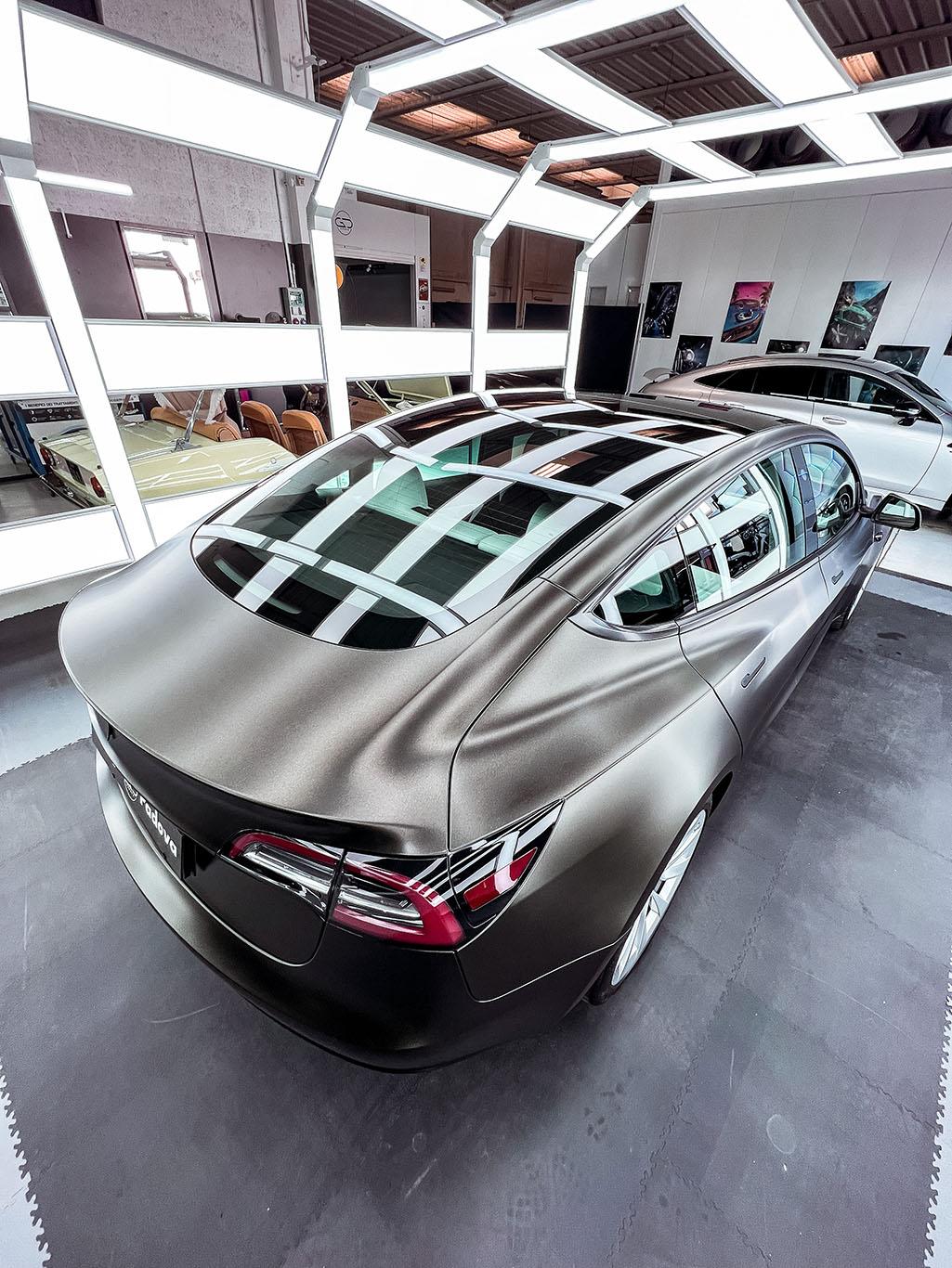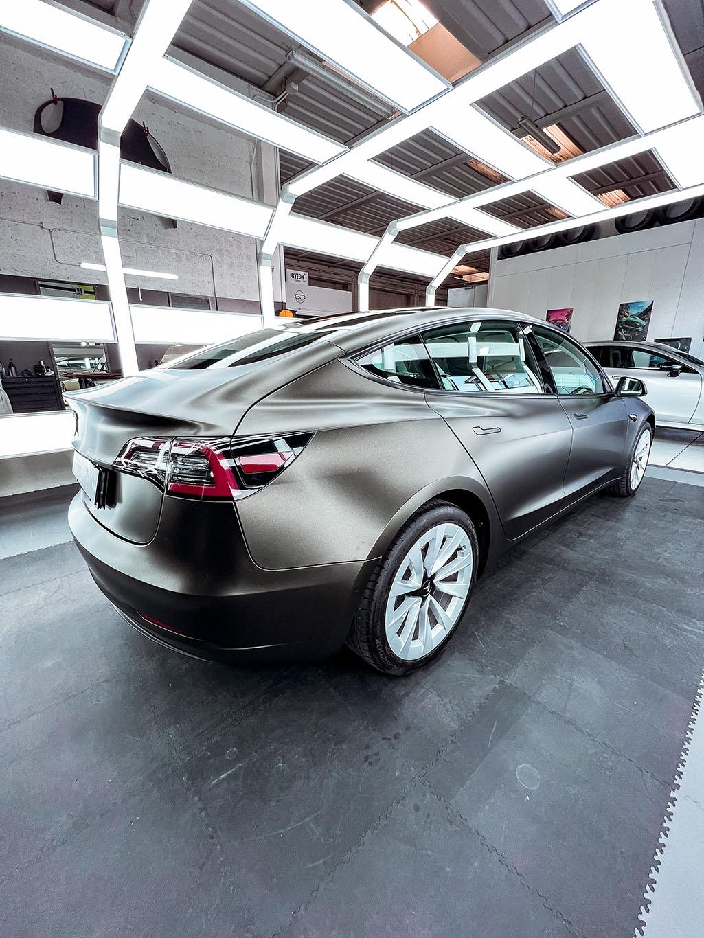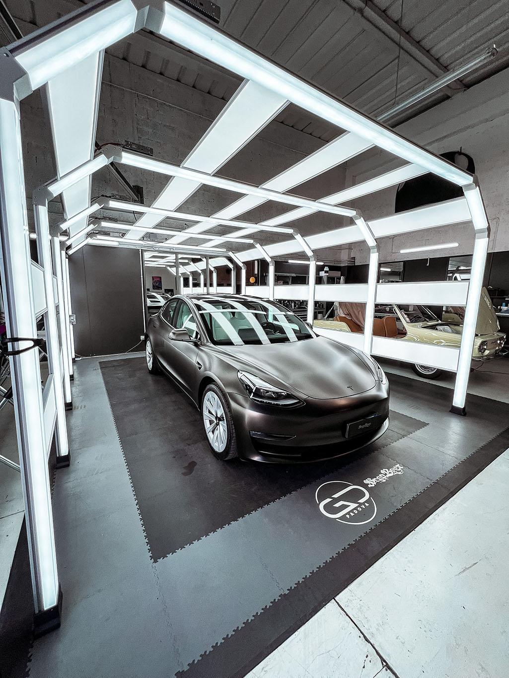 Rivestimento completo con pellicola 3M 2080 Black Dust Gold. Questa colorazione è molto particolare, il colore base è nero satino che in aggiunta all’oro metallizzato creano dei riflessi che accentuano le ‘nervature’ della vettura. Inoltre abbiamo sostituito i loghi della vettura con emblemi in nero opaco.